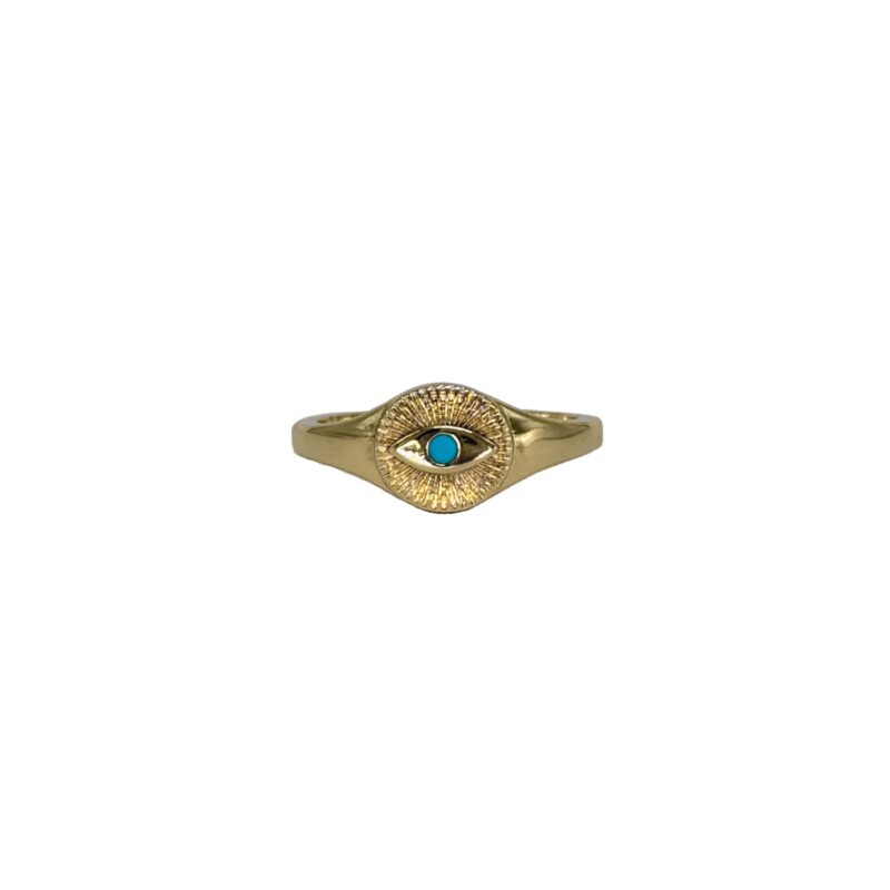Κλέψτε τις εντυπώσεις επιλέγοντας αυτό το εντυπωσιακό ανοιγόμενο δαχτυλίδι με μάτι και τιρκουάζ πέτρα. Είναι κατασκευασμένο από ορείχαλκο επιχρυσωμένο με χρυσό 18Κ. Υποαλλεργικό, ιδανικό για γυναίκες που επιθυμούν να ξεχωρίζουν με τις επιλογές τους.