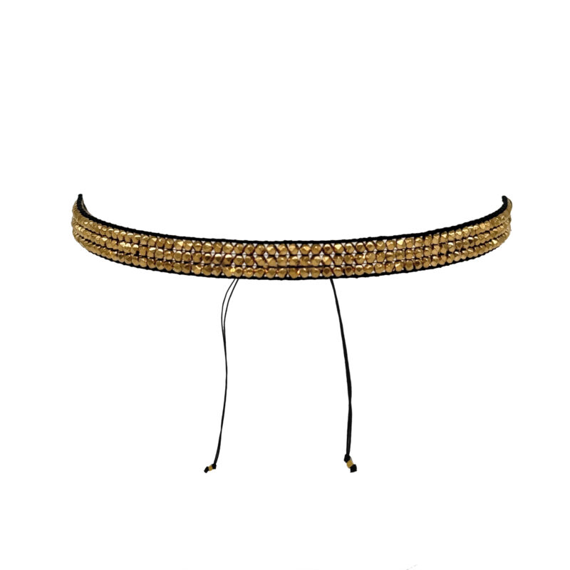 Choker υφαντό σε αργαλειό με ημιπολύτιμες πέτρες αιματίτη.Είναι γνωστός για την έντονη μεταλλική του λάμψη και τις ευεργετικές του ιδιότητες.Διαθέτει ρυθμιζόμενο κούμπωμα για άψογη εφαρμογή.